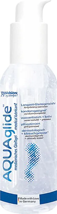 Glisse prolongée et sensations intenses avec le lubrifiant AQUAglide de JOYDIVISION. Sa formule à base d'eau offre une lubrification de longue durée, recommandée pour les jeux amoureux, qu'ils soient solo ou en couple. Homologué comme produit médical, il est également compatible avec le sexe oral et les préservatifs.