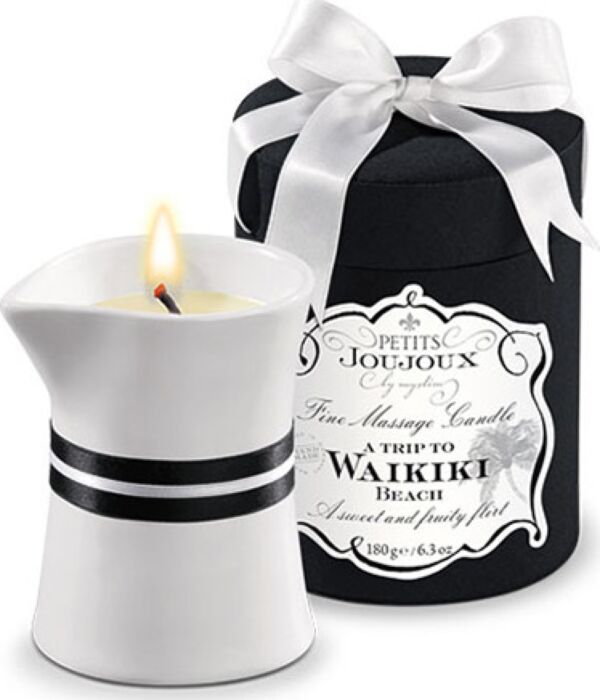 C'est une bougie de massage signée Mystim, présentée sous le nom PETITS JOUJOUX - A TRIP TO WAIKIKI BEACH. En boutique je te dirais que ce type de bougie sert à réchauffer et hydrater la peau tout en ajoutant une dimension sensuelle au massage : on l'allume, la cire fond et devient une huile tiède agréable au toucher. Elle convient bien aux couples ou à toute personne cherchant un geste sensuel et simple à utiliser.