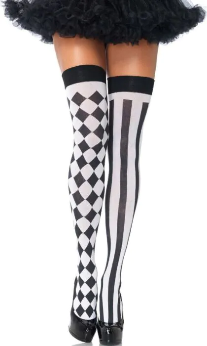 Ajoute une touche théâtrale à ta garde-robe avec ces chaussettes hautes arlequin en noir et blanc. Parfaites pour les soirées déguisées ou pour oser un look original.