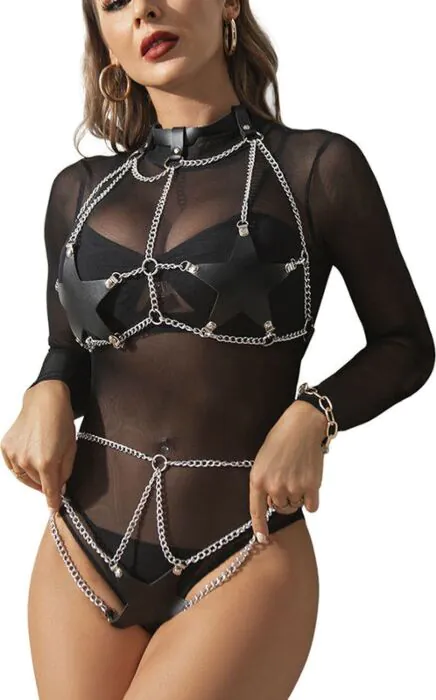 Un design captivant qui met en valeur votre corps avec élégance et sensualité. L'arêt de corps entier en cuir, orné de chaînes, apporte une touche audacieuse à votre garde-robe. Conçu pour celles qui veulent se sentir irrésistibles, il s'adapte à toutes les morphologies grâce à sa taille distinctive.