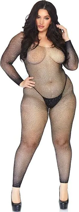 Voici un bodystocking en résille — une pièce qui joue sur la transparence et la brillance plutôt que sur le volume. Conçu pour celles qui veulent souligner leurs formes avec une coupe extensible et une finition sans coutures, il se porte aussi bien pour un moment intime que comme superposition audacieuse sous un blazer ou une robe échancrée. Les strass intégrés apportent un effet scintillant ; attention, ils demandent un traitement délicat.