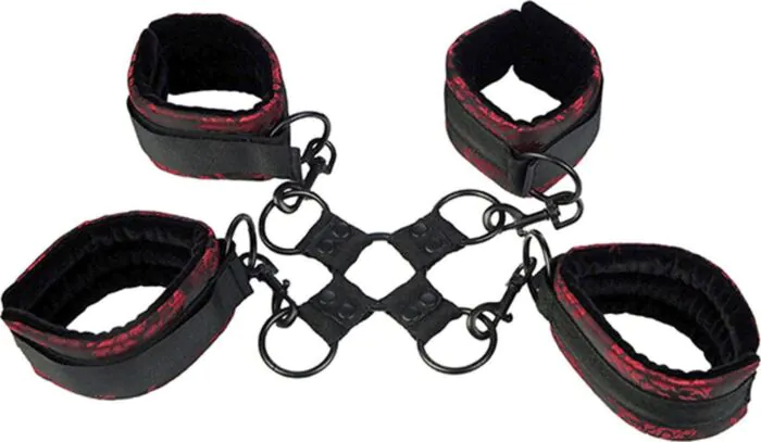 Voici un hog tie qui mise sur le confort et l'esthétique. Les quatre menottes sont douces et réglables, avec un extérieur en brocart rouge et noir qui ajoute une touche sensuelle à la contrainte. Le connecteur central solide muni d'une anille en O pivotante permet des changements de position rapides et sûrs, et les fermetures velcro rendent la mise en place et le dégagement très simples — utile quand tu veux garder le contrôle ou intervenir vite.
