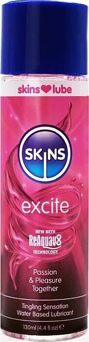 SKINS Excite est un lubrifiant intime à base d'eau conçu pour amplifier la stimulation locale. Sa formule contient de la L‑arginine, qui favorise le flux sanguin et intensifie la sensibilité, ainsi que des extraits de trèfle rouge et de Ginkgo biloba pour un effet tonique et stimulant. La texture est cristalline et légère, non grasse, et le produit se réactive en ajoutant juste quelques gouttes d'eau grâce à la technologie ReAquav8.