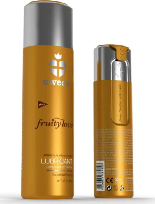 Fruity Love de SWEDE, un lubrifiant à base d'eau au goût fruits tropicaux et miel, pensé pour les jeux intimes et l'oral. Formulé uniquement avec des ingrédients utilisés par l'industrie alimentaire, pH 4,5 et compatible avec les préservatifs. Sans parabènes, facile à nettoyer et conçu pour offrir une lubrification durable sans irriter.