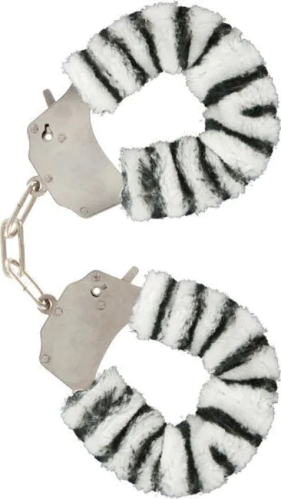 Ces menottes en acier chromé, recouvertes de peluche douce en motif zebra, offrent confort et sécurité. Inclus: 2 clés et un loquet de sécurité.