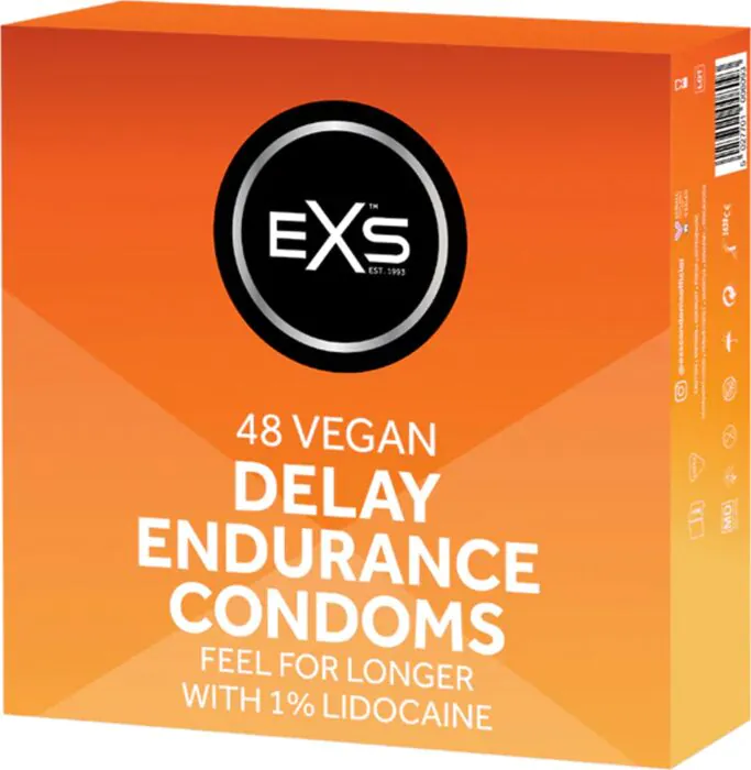 Boîte économique de 48 préservatifs EXS Delay conçus pour aider à retarder l'éjaculation grâce au chlorhydrate de lidocaïne. En latex naturel, lubrifiés au silicone et dotés d'un réservoir pour un confort quotidien. Conviennent à qui cherche une aide retardante sans renoncer au confort d'un préservatif classique. Ne conviennent pas aux personnes allergiques au latex.